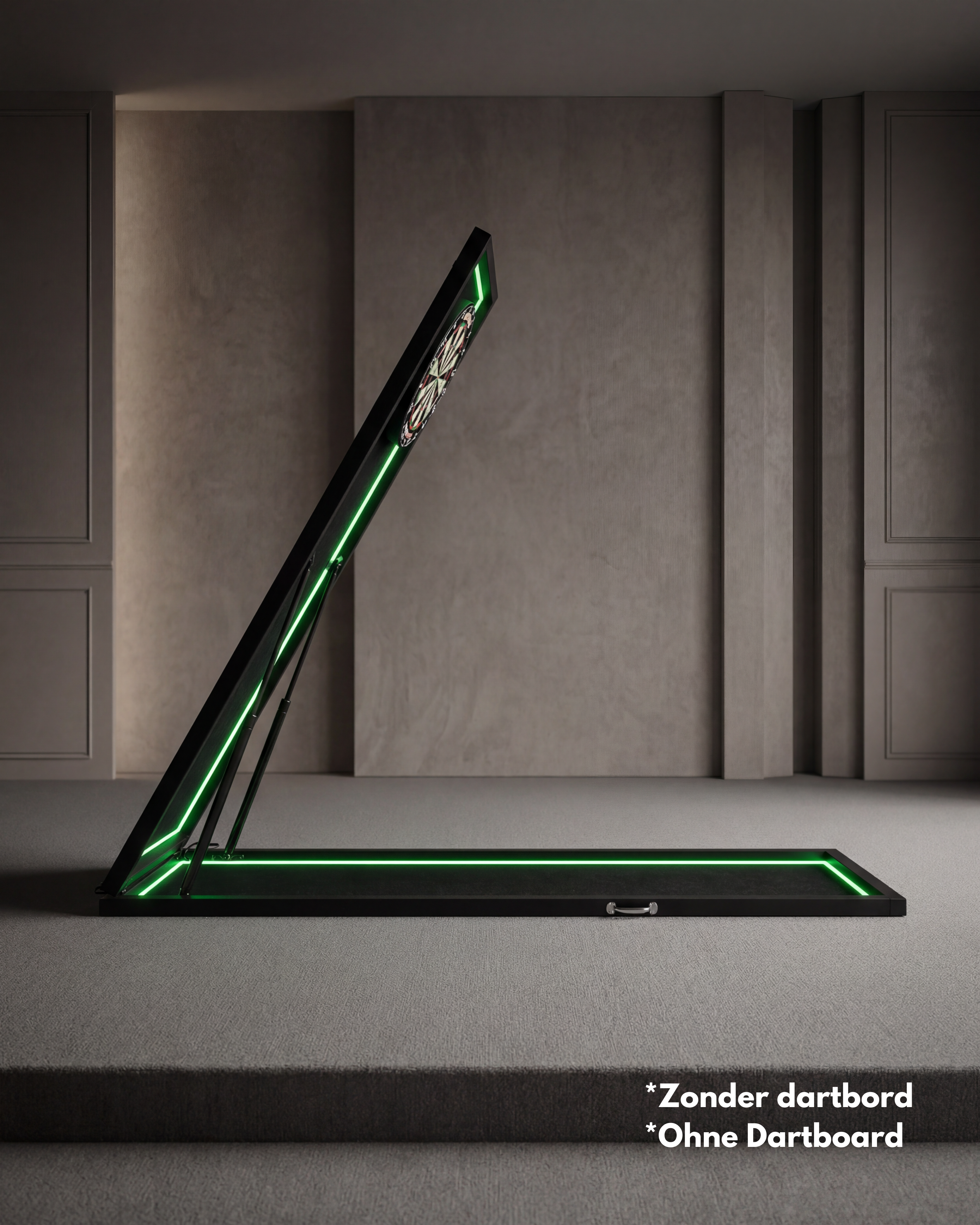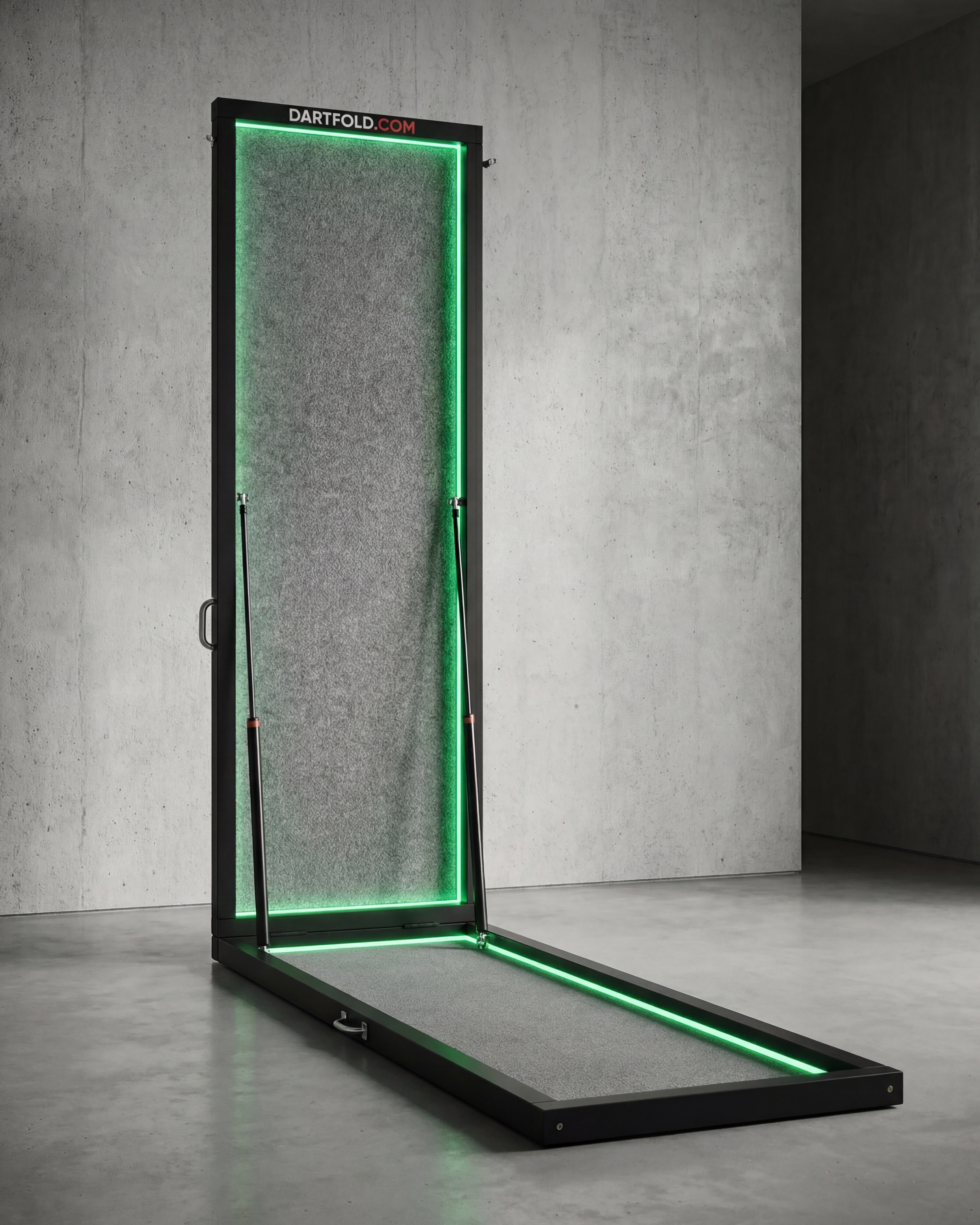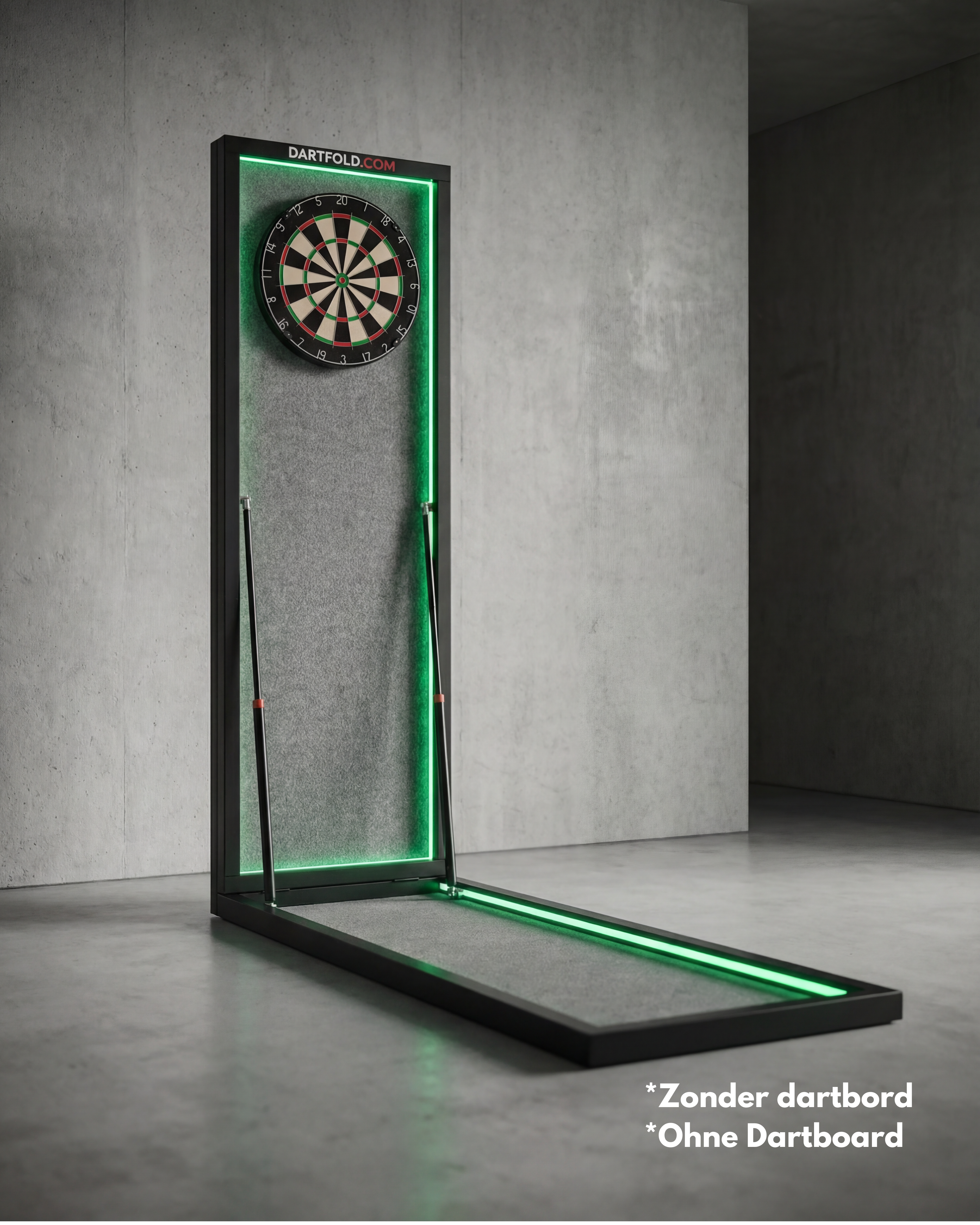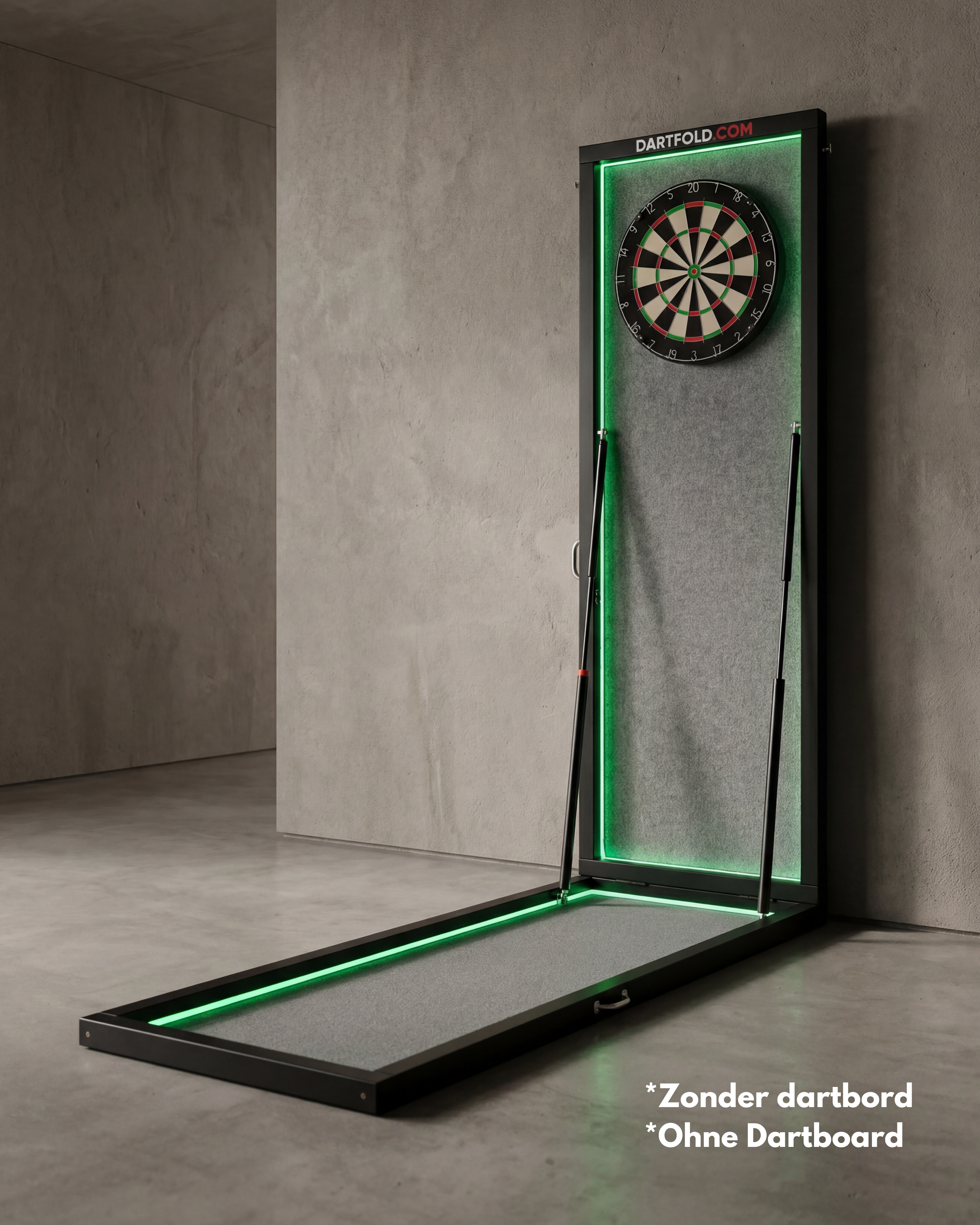 Geen vaste plek, een koude garage of gaten in je muur? Wij liepen er zelf tegenaan en bedachten Dartfold: een stijlvolle, inklapbare dartbaan met geïntegreerde baanverlichting.
